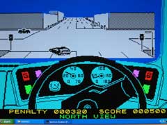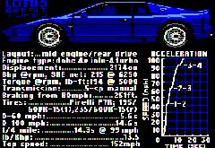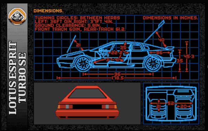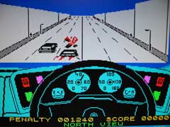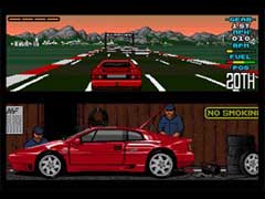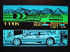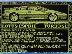 The only real clue that its an Esprit based game (apart from the tiny car on screen) is the dash, which someone has obviously paid a lot of attention to. The speedo shows 180mph, but car will only reach the quoted top speed of 150mph, revs go to 6500rpm. As befitting a Lotus, there are garages you can stop at for repairs on route, Did the programmer know something about Esprits or what?