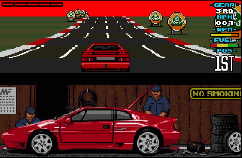 Released in 1991 as the much waited for sequel. The Esprit was dropped from the name as the game now also featured the elan SE. Gameplay was pretty much the same as the original, old school outrun style with a fixed car and a moving track. Not as fun as the original because you can't choose to race the esprit it just does on certain tracks and the elan on others.