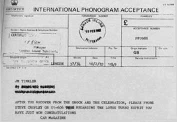 Lotus winner Jonathon Tinker (pictured above) was notified of his success by telegram (pictured) shareed a day at Lotus, Hethel, with under-25 winner Paul Simmons (pictured above) and was presented with his car by Lotus managing director, Mike Kimberley. Jonathon, who recently bought an Alfasud Hatchback is a computer software engineer from Surrey. He plans to keep the Lotus, sell the Alfa and to stay in touch with CAR, reporting his experiences.