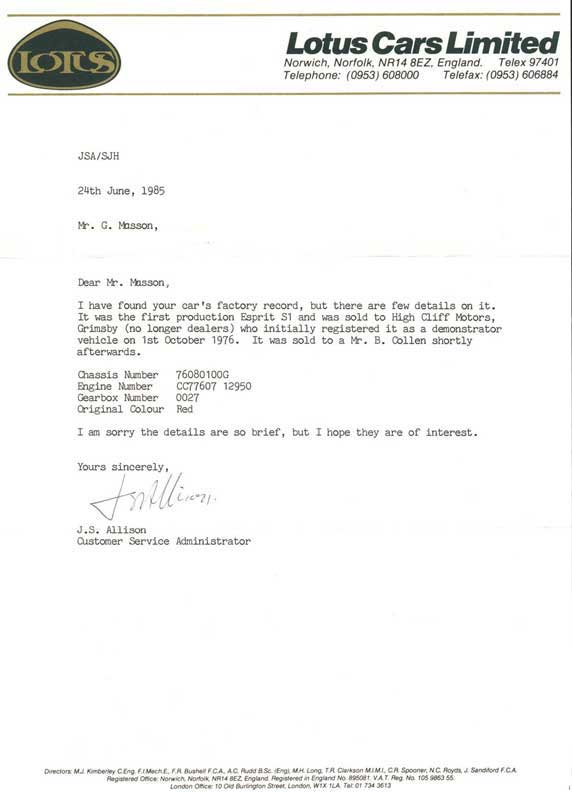Gordon Masson, who lives in Aberdeen, has owned the red Esprit – index number LFU 972R – for 21 years and hopes to drive it to Norfolk later this summer after the three-year restoration project is complete. Because the car's chassis number is 0100G. Mr Masson had originally assumed it was the 100th to have been produced. But a chance conversation with a Lotus expert revealed that it was actually the very first – a fact subsequently confirmed in writing by the Company (see below).