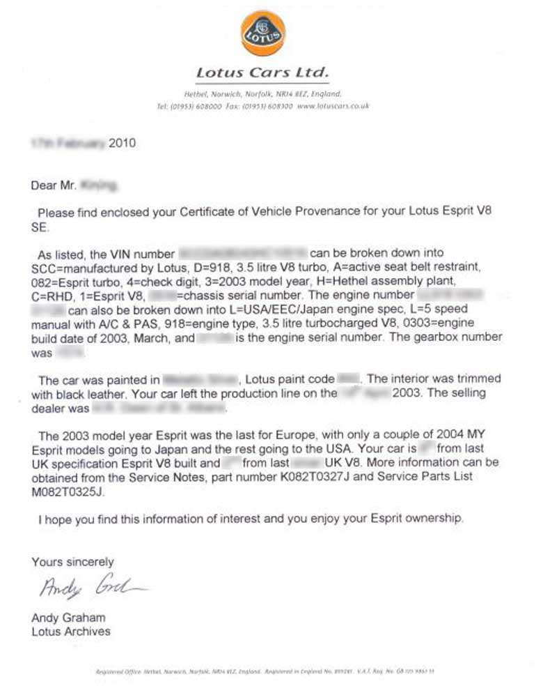 If you are interested in a Certificate of Provenance then contact Andy Graham via e-mail and provide VIN and full postal address. You'll need to pay £35 via debit/credit card which you can phone through on the number below. This service is available to all Lotus owners not just Esprit owners.