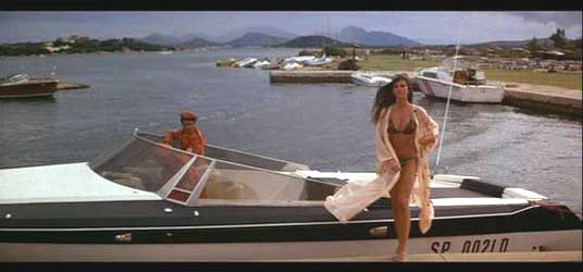 Since the film was made, the Cala de Volpe has not really changed that much, apart from being given a lick of paint or two. It was quite amazing to actually be in the exact spot that I remembered from all those years ago. These are the pictures I took while I was there. You may notice my extremely expensive orange juice on the table (15 Euros!) but more importantly, the area behind me is where the speedboat pulls up.
