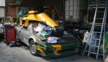 There was no bodywork aft of the b pillars except for the engine cover. The rear section and 1 rear alloy wheel was about 50 yds away. the other rear alloy was bent at 90 deg. Both cross struts between the a and b pillars were broken and all glass in the car was smashed. The drivers footwell had collapsed onto my right leg and the drivers door had been pushed in against my ribs. I was trapped for a few minutes until my fellow passenger managed to remove enough of the car for me to wiggly out.