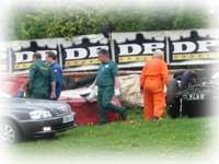 Thinking the worst, I ran over to see if I could help (always the hero!) and was second on the scene. The Marshall had already made contact with an (unbelievable) unhurt driver. Once one of the doors was pull open, he came out and was taken to the MED CENTRE. The car was removed quickly and the session restarted. A luck escape if you ask me!