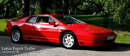 Turbo SE Year: 1991, first registered 1993 Colour: Calypso Red Interior: Magnolia Driving Style: Responsibly according to conditions Miles per year: About 2000, garaged during winter Owned Since: July 2007 Purchase from: Lotus Garage Pfenninger, Switzerland http://www.lotusautos.ch/ Serviced at: To be advised Other Cars: 2004 Audi A4 1,8QT Limo Previous Lotus': None Why an Esprit: Because it’s awesome in every respect. Upgrades: Remus 4-pot exhaust and Avon tires (by PO); blow-off valve, new tailgate lifters, hand brake lever, floor mats & door sills (Ramspott & Brandt). AC/vent display panel (Telstar One); ventilation knobs (LotusPerformance); gear knob (Moto-Concept). Flamebeater fire extinguisher (Elise-Parts); Momo Fighter Zebrano steering wheel (Torshov Bilrekvisita), Enamel Union Jacks / Lotus wing logos (Auto Regalia); alloy gear surround (Lotus Prepared by Claudius); Blaupunkt Bronx stereo, Morel Integra and Magnat speakers from local stereo shop. I have moved the “Design by Lotus” badge forward of the rear wheel arch. All modifications are reversible. Problems: Next to nothing