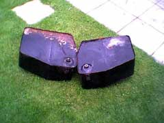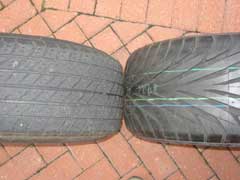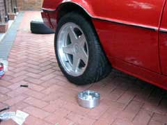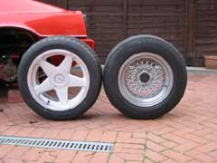 The car was fitted with the 15" BBS Mahle alloys with Goodyear NCT tyres. The wheels were OK but had a few kerbing marks and they needed re-painting. The rear tyres are also becoming very difficult to obtain so I decided to replace the wheels for larger items, which would allow the use of more commonly available tyre sizes. I did not want to go too radical with the tyre profile so opted for 16" rims on the front and 17" on the rear. To keep the overall gearing the same meant that the best tyre sizes were 205/50 16s front, 245/45 17s on the rear. The next issue was wheel type as the 'G' Esprit has an unusual offset on the rear (ET-20) due to the inboard brakes. Wheels available in this offset are hard to come by except as split rims which are very expensive and also look smaller than their size due to the rim bolts. The wheel I chose were Azev type 'A's, however these are only available up ET13 for the 17" rim and so hub-centric spacers would be required for the rear.Here you can see the new and old rear wheels side by side. The overall diameter is the same but the tyre profile is lower and tread width much wider on the new tyre.
