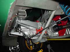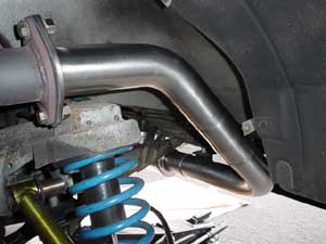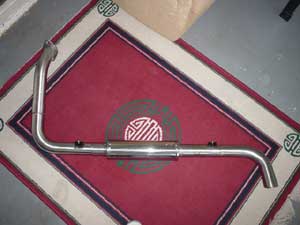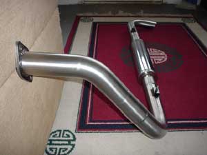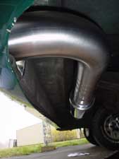 The exhaust was originally designed by Neil Micklewright of Players/ForsythRacing. I purchased two sections of stainless 2 1/2 inch pipe mandrel bent at 90degrees, and another bent at 45 degrees. All longer than needed for costom fitting. Very carefully I measured and cut, remeasured and cut again until all sections lined up as they should on the car. I then marked each joint exactly where it needed to be welded and had a friend of mine do the welding. The mounts are made from 1 inch square tube cut in half with 1 inch 5/16th galvanized steel bolts. I bolted it to the car, fired the engine and wow! Music to my