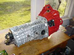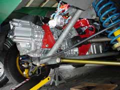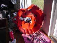 While I had everything apart I decided to just redo everything. All hardware was replaced with grade 8.8 or higher including bolts for the rear main oil seal housing. Installed new rubber gearbox mounts. Bead blasted all related parts and powder coated clear. The natural color of the metal after bead blasting is absolutely beautiful. Painted the bell housing and gearbox mounts to match the original Lotus red, then clear coated to protect the color.