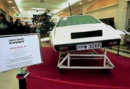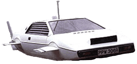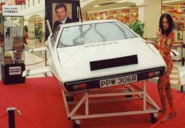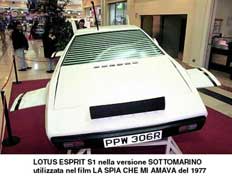 While this remarkable car "prop" does not have engine or running gear it remains a rare and eye-catching exhibit; In "the spy who loved me", James Bond (Roger Moore) modified Lotus provides much of the film's excitement. It is used by the film-makers as an updated version of the aston Martin with the additionalimpressive feature that this car turns into a submarine. As a road car it is involved in an entertaining chase around Sardinia pursued by a missile-launching motorbike, Jaws (Richard Kiel) and a car full of Stromberg's henchmen, and finally by Stromberg's mistress Naomi in a helicopter. In an effort to evade Naomi, Bond accompanied by Russian agent Anya Amasova (Barbara Bach) drivers the car off a jetty into the sea where it trasforms into a submarine. Bond uses one a remarkable Lotus' many features - a missile-launcher - to dispose of Naomi and proceeds to take a closer look at Stromberg's underwater base. Having utilized the submarine Lotus' arsenal of weapons including ink jets, torpedoes and mines to fight off Stromberg's hostile drivers. Bond drivers the car up a beach to the amazement of the many holiday makers.