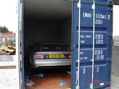 Last image is car carefully unloaded at freight forwarders yard in London ready to be loaded into a new container and secured for its journey ahead.