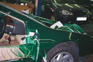 The effects of bad jacking practices on the rear lower suspension which connects to the hub carrier. The other shows the fine job Frosts did of removing the aerial and filling the hole where it once sat.
