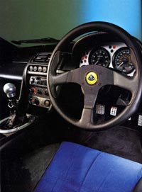 The new Esprit Sport 350 has the lightest magnesium wheels obtainable. It has a rear wing developed for a track car, made of carbonfibre, sitting on milled aluminium pylons. It has two-piece racing brakes discs. It has firmer suspension then ever. It also has and this is a first in my experience colour-coded loudspeaker cones, little circles of blue visible through the grilles at either end of the dash-top that exactly match the shade of paint on the AP Racing brake caliperss. This may be the most extreme and sporting Esprit ever, but that didn't stop Lotus having a few little visual larks on the side.