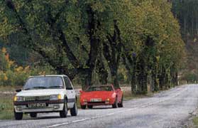 Narrow, twisting roads and my unfamiliarity with the Lotus allowed Stinson in the 205 to overtake a few stragglers and pull clear. The Esprit is a wide beast (broader than a Merc S-class), and when you're driving it on the 'wrong' side of the road, unless you can see a fair way ahead, you daren't start edging out for a peek. During my efforts to catch up, I began to enjoy the Esprit and my confidence grew. It needs to be driven hard before it reveals much advantage over the Peugeot. The fast it goes, the sharper its responses become and the more spirited it seems. And it has such phenomenal acceleration it simply explodes between bends and past other cars. The 205 was rapidly caught, so I began handing back to do it all again.