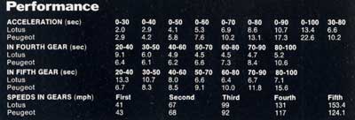 ENGINE LOTUS PEUGEOT Configuration In-line four In-line four Capacity (cc) 2174 1905 Bore (mm) 95 83 Stroke (mm) 76 88 Compression (to one) 8.0 9.6 Valve gear Dohc, 16v Sohc Aspiration Twin carbs, turbo Fuel injection Power (DIN/rpm) 215bhp/6000 130bhp/6000 Torque (DIN/rpm) 220lb ft/4250 119lb ft/4750 TRANSMISSION Type Five-speed manual Five-speed manual Ratios (mph/1000rpm) First 3.36 (5.80) 2.92 (6.20) Second 2.05 (9.50) 1.85 (9.80) Third 1.38 (14.10) 1.36 (13.30) Fourth 1.03 (18.70) 1.07 (16.90) Fifth 0.82 (23.70) 0.86 (20.90) Final drive ratio (to one) 3.88 3.69 CHASSIS AND BODY Construction Steel backbone chassis, glass fibre body Steel monocoque Front suspension Independent, upper and lower wishbones, coil springs, anti-roll bar Independent, MacPherson struts, coil springs, anti roll bar Rear suspension Independent, transverse links with radius arms, coil springs Independent, trailing arms, transverse torsion bars, anti-roll bar Steering, type Rack and pinion Rack and pinion Turns lock to lock 3.0 3.8 Turning circle (ft) 36.0 33.8 Wheels 7.0x15 front, 8.0x15 rear 6.0x15 Tyres 195/60 VR15 front, 235/60 VR115 rear 185/55 VR15 Brakes, type Discs all round, vented at front Discs all round, vented at front DIMENSIONS (in) Wheelbase 96.8 95.3 Front track 60.0 54.4 Rear track 61.2 52.7 Overall length 170.5 145.9 Overall width 73.2 61.9 Fuel tank capacity (gal) 17.3 11.0 Kerb weight (lb) 2795 1929