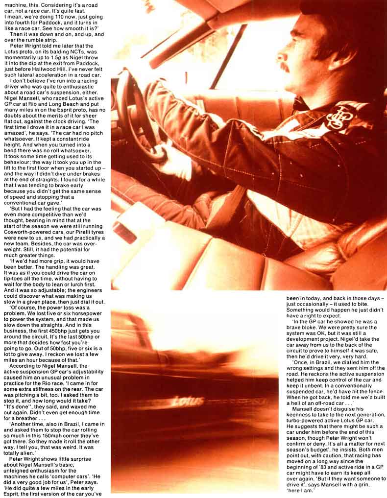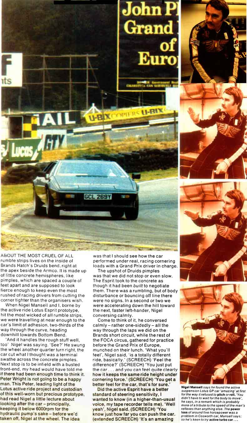 Active Racer Nobody's spent more time in active suspension cars than Lotus' ace GP Driver, Nigel Mansell He tested the 'mule' Esprit; he raced the active GP car. Here, he drives Brands Hatch Car Magazine November 1983