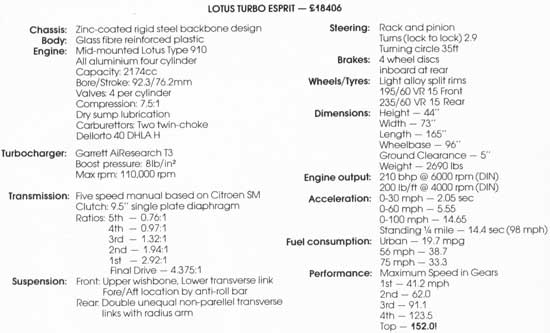 Ever the gentleman, I beckoned darling Alison to the passenger door, but curses! A couple of ad lib off-the-cuffs were required to maintain the cool image as I fumbled to find the correct key from the four on the ring. Another from the remaining three opened the spitfire-type lock on the rear hatch, but alas, the Lotus was obviously designed for the person who carries a document rather than an executive case. Subsequent failure to open the front had dear old Al' carrying both brief case and editorial flying jacket on her lap. A couple of cranks saw the blown twin-cam roar into life, but the archaic and poorly lit smiths instruments, and the out of step rise of the headlights typified the Italian-styled exotic as a British car. However, no sooner did the Garrett T3 blower come in to squirt the Esprit to sixty in a whisker under six seconds, than these petty niggles were simultaneously blown away. The aircraft-nose exterior and interior styling is wholly unpretentious and a worthy compliment to the soaring, surging qualities of the Esprit.