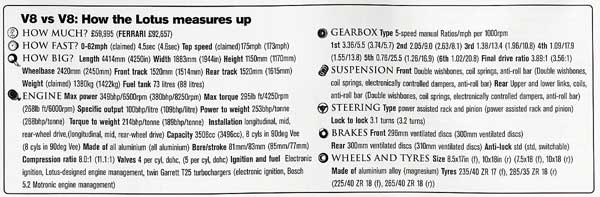 The less sympathetic view says the Esprit V8 is a crushing disappointment, a car which provides more of the one raw ingredient the four-cylinder car never lacked, speed, yet leaves intact the faults that infect the car, from its ghastly gearbox to tis cramped cabin. Sure, throttle response has been improved, but it remains considerably less than halfway between a four-cylinder Esprit and the engine of, say, a 911 or F355. The reason the Ferrari costs so much more is simply because it is worth it. Dynamically, it comes close enough to the Lotus for the performance differential to be inconsequential in all bar race conditions, while qualitatively it is like comparing fast food to a meal in a three rosette Michelin restaurant: both will fill you up, but you don't need to ask why one costs more.