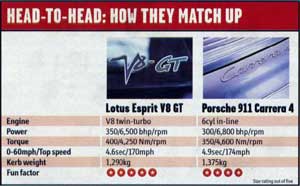 Within the supercar format, though, Porsche and Lotus have taken very different approaches to their vehicles. The Porsche 911 is a rear-engined, four-wheel-drive, normally aspirated model which is built from steel in Stuttgart. On the other hand, the Lotus is a mid-engined, turbocharged, rear-wheel drive car with a body fashioned from fibreglass in Norfolk. However, the two do share a love of power because the 911's flat six-cylinder engine boasts 300bhp, while the Esprit's V8 is good for an awesome 350bhp.