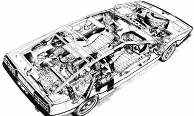 There are no major changes. The basic layout stays the same Lotus's 2-litre 160bhp light-alloy four sits longitudinally behind the driver, mated to the Maserati five-speed transaxle originally made for the now-dead Citroen SM. Coil-spring suspension is partly borrowed from the Opel Ascona in front double wishbones with an integral anti-roll bar and Lotus's own Elite-based three-link independent arrangement at the back, using the drive shaft as one member. The body uses Lotus's remarkable low pressure injection moulding method (details of which Lotus still try to keep from competitors) to form two glass-fibre sections, upper and lower, like a plastic model car; the necessary join at waist level is made a feature of the Ital Design styling.
