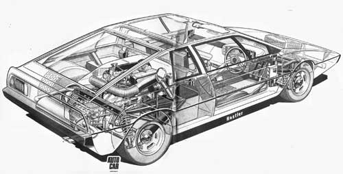 The first Esprit was a Giugiaro design study shown at Turin in 1972, the result of a conversation between the stylist and Colin Chapman at the previous Geneva show. It had the entire tail lifting up and the steeper screen. But design and development of the car is the work of Tony Rudd, Engineering Director in charge of Advanced Engineering, and his team, with Chapman intimately involved the whole way through. It is very much a team, each member doing the other's work at one time or another, typically of the much healthier atmosphere of a small concern compared with a huge department of a much bigger company. When the first road-going prototype was being assembled in January, everyone was hauled in to building, including Ralph Bellamy who was supposed to be getting on with other work for the rear end of Lotus Grand Prix cars, and Rudd. It was finished a 1am, leaving at 4 in company with an Elite to be driven to London Airport to meet Lotus chairman Colin Chapman, who was returning from the Argentine Grand Prix, so that he could drive it back to Norfolk.Prices were to be announced after this went to press; this should be the cheapest Lotus. Having driven only the prototype, we should not talk in detail about impressions of the Esprit, except to say that regardless of inevitable noisiness in a machine still in the early stages of development, it clearly has the makings of one of the very best Lotuses there has ever been very fast, very safe, and very great fun. We look forward to Road Testing it.