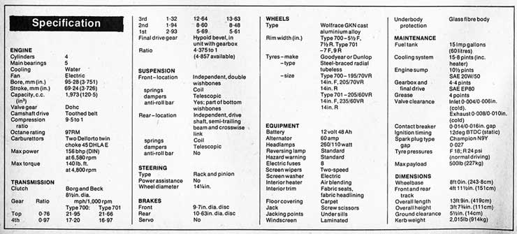 Elite drive shafts and hubs are used, with the exception that the studding is different, to suit the Wolfrace GKN wheels. In the best interest of handling and traction, wider wheels and tyres are used at the back than at the front 195/70 VR14 on 5.5 inch front with 205/70 VR14 on 7.5inch rear on the Esprit 700, and 205/60 VR14 on 7inch rims front with 235/60 VR14 rear on the Esprit 701, these being the most important differences between the two type numbers. The tyres themselves are steel-braced radial-ply tubeless, probably Goodyear G800+S Grand Prix, though Dunlops were also under consideration.