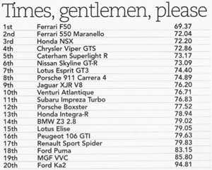 Lap time: 74.40secHere's one of the, shall we say, more senior among our group of 20. But there has never been much wrong with the Lotus Esprit as far as its ability to go round corners is concerned, thanks in part to a well-sorted double wishbone suspension layout at both ends.