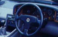 That of the Venturi is superior. Aston Martin could not better its striking leather-and-walnut cockpit, and Lotus cannot match it. It's tasteful, opulent and superbly executed (MVS makes much of its purple-prose brochure of cabin craftsmanship). Even though most of the facia's component parts switchgear, vents, heater controls are sourced from lesser cars (trying to identify them passes motorway time), the Venturi's dash is clean and cohesive. It's small, reflecting instruments are no easier to read than the Esprit's, attractive though they look as a cluster, but there's nothing to make you feel ill at ease at the leather-rimmed wheel of this tearaway, even less to induce self-consciousness. Pride and well-being, but never embarrassment. You do, however, feel deprived of aural uplift. Everyone condemned the hissing turbo as intrusive and uninteresting. Venturi would do better to cultivate a more stimulating sound as Honda has done with the NSX than that of a hoover nozzle with your finger up the spout.