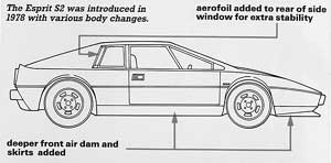 The first updating of the Esprit came in August 1978, but it was minor surgery on a tight budget, aimed at tackling some of the early criticisms. Those had included dubious build and trim quality, lack of power to match the cars dramatic looks and an unpleasant steering feel.Visibly, the car gained a new, integrated front air-dam, cooling scoops aft of the rear quarter windows and new alloy wheels, Inside, both trim and instruments were improved. The engine gained new cams and the front suspension geometry was subtly revised to give a more consistent feel. The changes were at least partly successful, with slightly better performance, considerably better steering and a bit more comfort. Refinement was still lacking, however, especially in the amount of road noise generated by the original rear suspension with its driveshaft as the top link.