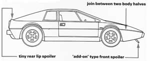 The most important change was chopping a couple of inches out of the wheelbase, on Chapmans orders, which made the car look better balanced but at the expense of interior room for taller drivers. The Esprit was also given a virtually flat windscreen, a small lip spoiler under the nose and a slightly different tail profile, to improve high-speed stability. It lost its big engine cover in favour of a small lid. The shape was also modified to enable Lotus to mould the shell in two simple halves, top and bottom.