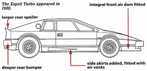In February 1980, Lotuss enigmatic Grand Prix sponsor Essex Petroleum held a huge party in the Albert Hall in London to outline their racing plans, and at the same time Lotus unveiled a new and even more dramatic-looking Esprit in Essexs dark metallic blue, red and silver colours, The new look by Giugiaro, was chunkier and more aggressive than the delicate original, with big front and rear air-dams, a louvred rear window, a spoiler across the tail and deep, wide side-skirts with cooling ducts, This wasn t just a cosmetic lob, though; under the skin was a greatly strengthened chassis with improved front and a totally redesigned rear suspension, at last with a top link to take the load from the driveshafts. Tyres were much wider, on new alloy wheels, the front brakes were bigger, and everything pointed to more power. The car certainly had that; up to 210bhp and 200 lb ft of torque thanks to the addition of a Garrett T3 turbocharger on a heavily revised version of the 2.2-litre four. This Turbo Esprit (now claimed to be a 150-mph-plus car) was originally offered only in Essex colours, with very high-spec trim and at a staggeringly high price, but in April 1981 Lotus offered more basic trim and conventional colours for a great deal less money, and the Turbo Esprit became their best-seller.