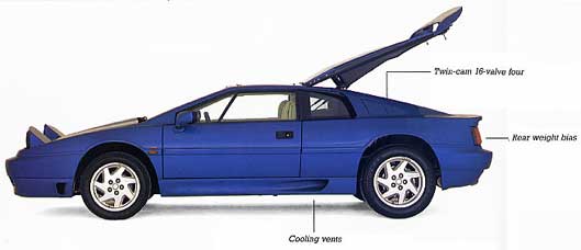 From just 215 bhp Lotus upped the output of the 2174cc four to a staggering 264bhp at a stroke. The chief trick was the use of what Lotus called a chargecooler, or what everyone else would have called an intercooler. It was water-cooled and worked extremely well, feeding cooler and thus denser air to the engine, increasing the amount of fuel/air mixture the engine could burn and so increasing its power. There was a little more to it than just the chargecooler, though; the traditional twin Dellortos were replaced by a rather more modern fuel injection system with full electronic engine management. The changes were so effective that all this extra performance was available despite a catalytic convertor being fitted.