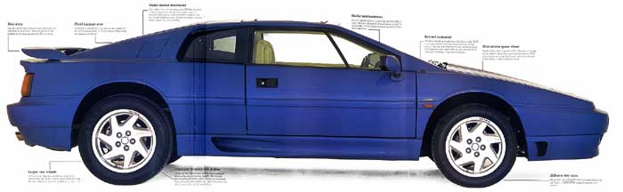 In October 1987 at the London Motor Fair, the Esprit changed almost everything except its name. It had a new body, a new interior, further chassis updating including better brakes and a Renault transaxle in place of the old Citröen type, and a completely new character. The restyling was done in-house, by a team headed by chief designer Peter Stevens. Although virtually all the main dimensions are practically unchanged, the car looks totally different, with a new and beautifully integrated softness of line replacing the old angulanty. It gives the car a more substantial look while remaining recognisably Esprit, and the new shell is both easier to make and markedly stiffer than the old, and this further improves the whole car. The 215bhp Turbo differs from the 172-bhp non-turbo in having a three-quarter window between the rear buttresses, a small rear lip spoiler and a deep rear air-dam, all of which led to substantially better aerodynamics.
