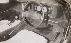The Esprit's Veglia instruments are attractively styled with green backgrounds and quite well calibrated. Two major dials the speedometer and rev-counter dominate the console, with an oil pressure gauge and water temperature gauge to the left and the fuel gauge and a battery condition indicator to the right, all these four instruments being semicircular. There is a display of warning lights running along the top of the console.