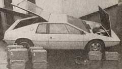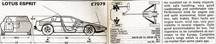 Despite being a two-seater, the Esprit is actually 1.75 inch wider than the Elite/Eclat, due perhaps to a certain extravagance in its conception, its glass fibre body being based on a styling exercise created by Giugiaro and exhibited at the 1972 Turin Show. For the same reason, possibly, the new bodyshell suffers from considerable visibility problems. The Esprit, however, is 1.75 inch shorter in the wheelbase, 10 inch shorter overall and 3 cwt lighter than its front-engined stablemates.
