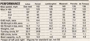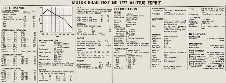 The Esprit we tested was not hampered by such encumbrances as air conditioning and the steering is not assisted, so with a lower weight and less power 'leaks', one would expect an appreciable improvement in performance over the other Lotuses. Indeed there is, though we could not approach the claimed figures of 0-60 in 6.8 sec or the standing quarter in 15.0 sec, which would really put the Esprit into the supercar class.