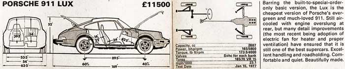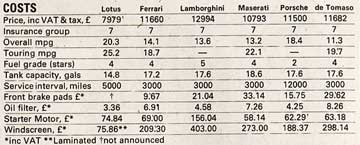 Like all the new Lotus models the Esprit is very much more expensive than its predecessor. Originally estimated at £5000 at its introduction in 1975, inflation has increased the price to nearly £8000. Even at this level, however, the car is £2000-£5000 cheaper than other high-performance sporting cars such as the Porsche 911 N, the Ferrari 308 GTB, the Maserati Merak and the Lamborghini Urraco supercars the Esprit matches in some respects, not in others.