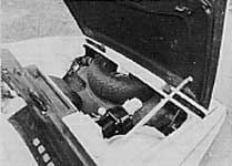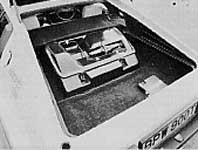 The front compartment contains the emergency spare wheel and tyre (these are of different sizes front to back on the Esprit) and space only for small items. Wiring and hydraulic pipes look a bit exposed. The release for this compartment is a bar under the dashboard on the drivers side but it is apt to hide itself away completely when released. That for the rear compartment is a small T-handle in the offside door shut. This opens the large strut-assisted tailgate that extends back to the side window line. A tonneau protects luggage from prying eyes, and the engine cover unclips for access which is not a strong point. Fuel filler caps for the twin tank are not lockable the tanks are connected by a balance pipe. The Esprit has separate sidelamps and the head-lamps will raise and flash in one operation using the right-hand stalk. Strident horns are fitted; a single wiper lacks an intermittent facility but has two speeds, the faster being usefully so. This large wiper leaves an unwiped area to the right which enlarges the blind spot created by the pillar, and the parallel link bar flew apart but was quickly put right by Tim and Zoe Handles at Stoke. The engine is a little difficult to catch but warms up quickly the choke appeared not to be connected on the test car. Heating is adequate but ventilation is still not over-good even with the noisy fan operating on second speed. Two ashtrays are provided on the sills but are poorly positioned and the lack of a cigarette lighter is surprising in this class of car, as is the lack of warning lamps or even reflectors for the large doors. I personally disliked the dark brown cropped velour, which covers doors and the large expanses in front of driver and passenger. It does not in my opinion fit in with the quality image Lotus is presumably seeking with this car but the leather seats break the monotony.