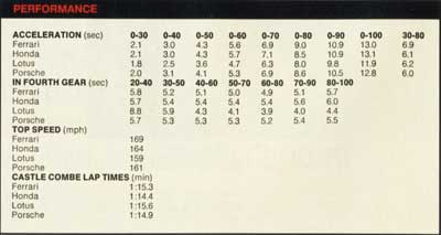 And go fast! Faster, on any winding moorland road, than the other three. Easier to drive fast, what's more. The softer and more yielding nature of the suspension (double wishbone all round, although unlike the Ferrari's prosaic steel set-up, the Honda's are by elegantly forged aluminium alloy arms) means the car has nothing like the Ferrari's nervousness on sinuous British moors about the only public roads where, in this country, cars like this can be pushed hard.