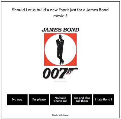 Bit of fun set-up by a Fan of when Bond was in a proper spy car? Click on the image below to go to the site to vote.–––––––––––––––