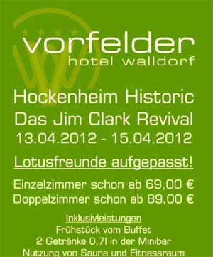 Bahnhofstraße 28 · 69190 Walldorf · Fon +49.(0)6227.699.0 · Fax +49.(0)6227.30541 info@hotel-vorfelder.de · www.hotel-vorfelder.deOn 1st January 1952 Colin Chapman founded the Lotus Engineering and thus the first racing car Lotus Mark 4 Trials Car was created, reason enough to celebrate a little highlight at Brands Hatch.