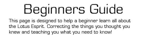 This guide is for those who have just discovered the Esprit and want to find out the basics, before trying to navigate the site for all the information. We will introduce you to the Esprit, right from it's first model, the S1 to the last model produced by Lotus, the late V8. We will also try to go over the basics of the car, from engines, chassis and wheels, to where the handbrake is. We will use links in this guide to help you find out everything and keep this guide a reasonable size. Click on the links, check the info and use the back button to come back to this guide.